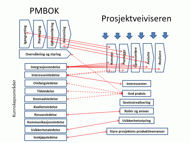 Hensikten med figuren nedenfor er å synliggjøre relasjonene mellom strukturen i PMIs PMBOK og Prosjektveiviseren. Stiplede piler antyder noe svakere knytninger enn de heltrukne pilene.