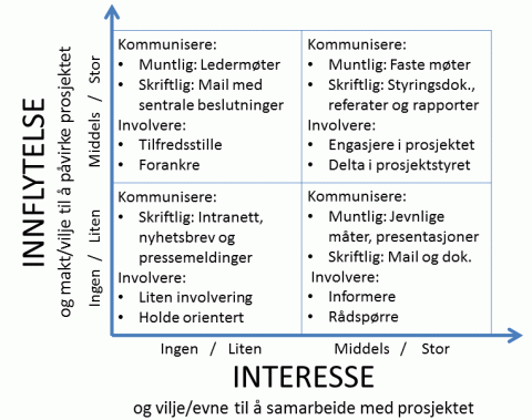 Som hjelp til å bestemme hvilke tiltak som er mest hensiktsmessig for hver interessent kan man bruke en illustrasjon som vist nedenfor. Hvor i dette diagrammet den enkelte interessent hører hjemme vil være bestemt av den graden av interesse og innflytelse som ble angitt i forbindelse med analysen i forrige trinn, «analysere interessenter».