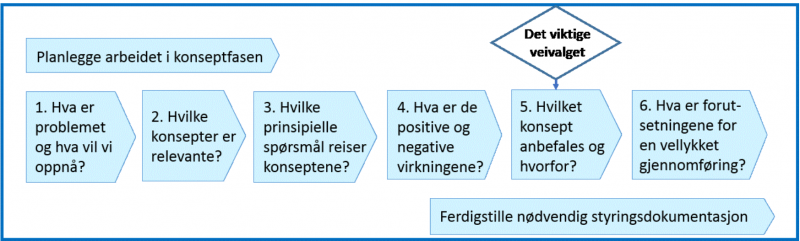 Konseptfasen starter når virksomhets-ledelsen ved beslutningspunkt 1 har bestemt at de skal gjøre noe med et behov eller problem de har identifisert. De har derfor iverksatt en konseptfase for å utrede ulike tilnærminger for et mulig prosjekt, vurdere hvilke gevinster dette vil kunne bidra til, og hva et slikt prosjekt vil innebære. Herunder hvilket behov for endringer i organisasjon og virksomhetsprosesser prosjektet må ivareta for at de forventede gevinstene skal kunne realiseres.