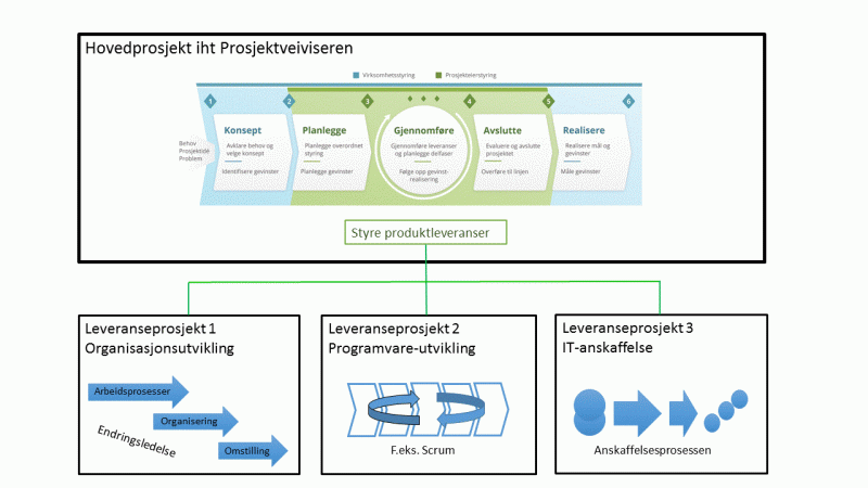 Figuren ovenfor er ment å synliggjøre at det å styre fremskaffelsen av prosjektets produktleveranser er en viktig del av den daglige, praktiske prosjektstyringen som ligger under prosjektlederens ansvar. Imidlertid er denne detaljerte prosjektstyringen lite beskrevet i Prosjektveiviseren, mens den overordnede prosjektstyringen er mye sterkere vektlagt. I mange prosjekter vil fremskaffelsen av de ulike produktleveransene være organisert som leveranseprosjekter som leverer sine resultater til hovedprosjektet.