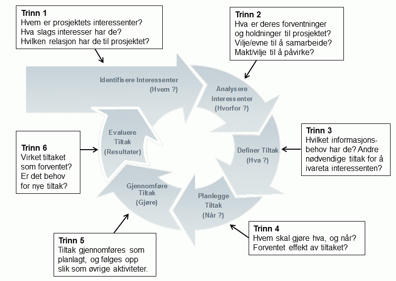 Ved å gjennomføre en interessentanalyse og oppdatere den jevnlig, for eksempel i forbindelse med hver faseovergang, vil prosjektet legge grunnlaget for god medvirkning fra interessentene. Dette forutsetter imidlertid at det iverksettes relevante tiltak. Uten disse tiltakene vil analysen i seg selv ha liten verdi. I hvilken grad prosjektet oppnår den nødvendige støtten fra sine interessenter er avhengig av innhold og gjennomføring av de tiltakene som iverksettes. Rammen for denne veiledningen er derfor satt til interessenters medvirkning og ikke begrenset til bare interessentanalyse. Å ivareta interessentenes medvirkning omfatter derfor alle de 6 trinnene: